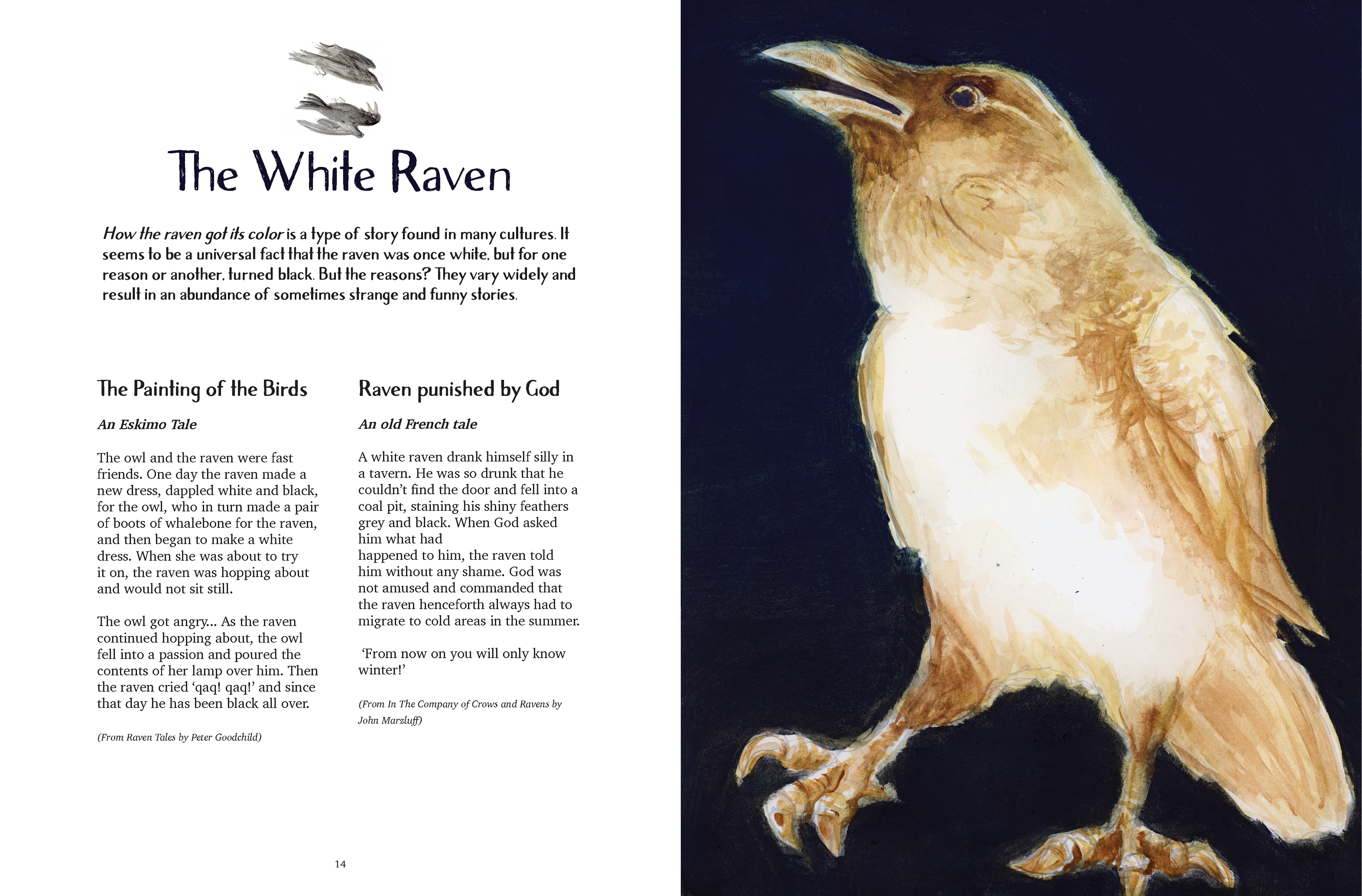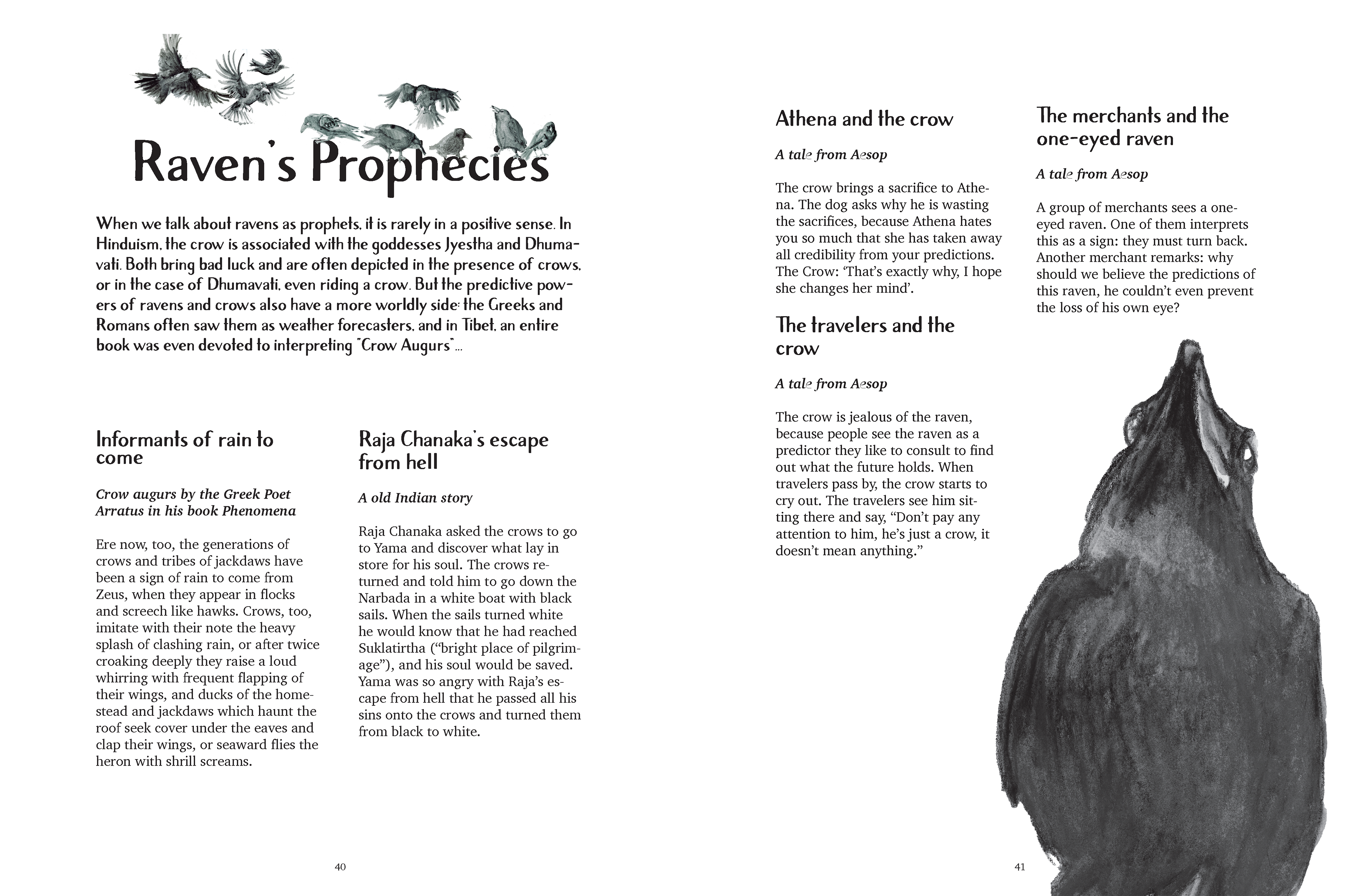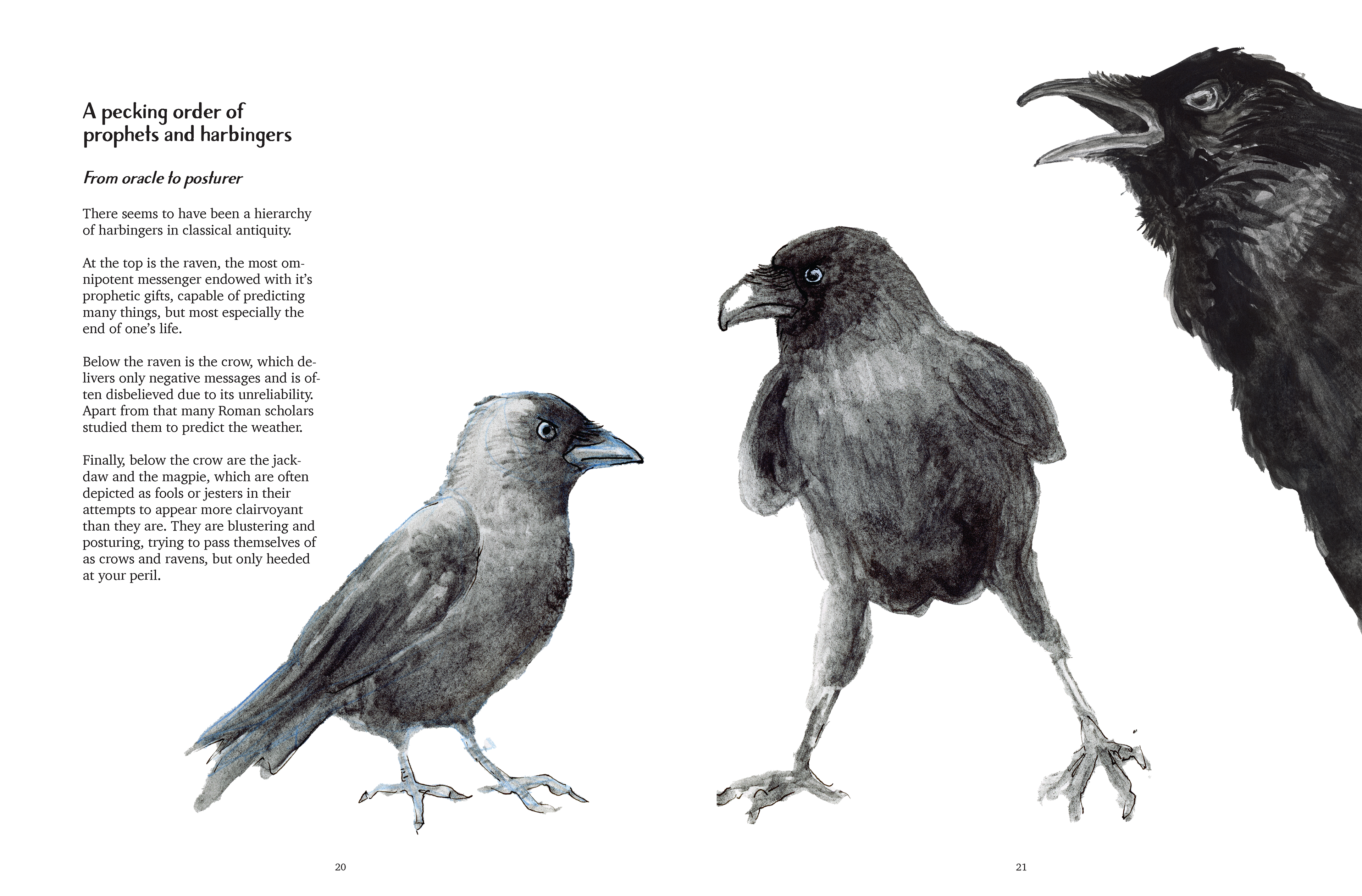 This book-to-be is a prototype of a non-fiction illustrated book about all things 'Corvid'. It will be filled with both fabled and little known stories, scientific fact and - of course - full page illustrations. It will range from the ancient to the contemporary, tracing myths, stories and legends in which our black feathered companions warn us, trick us and - mostly by accident - help us.